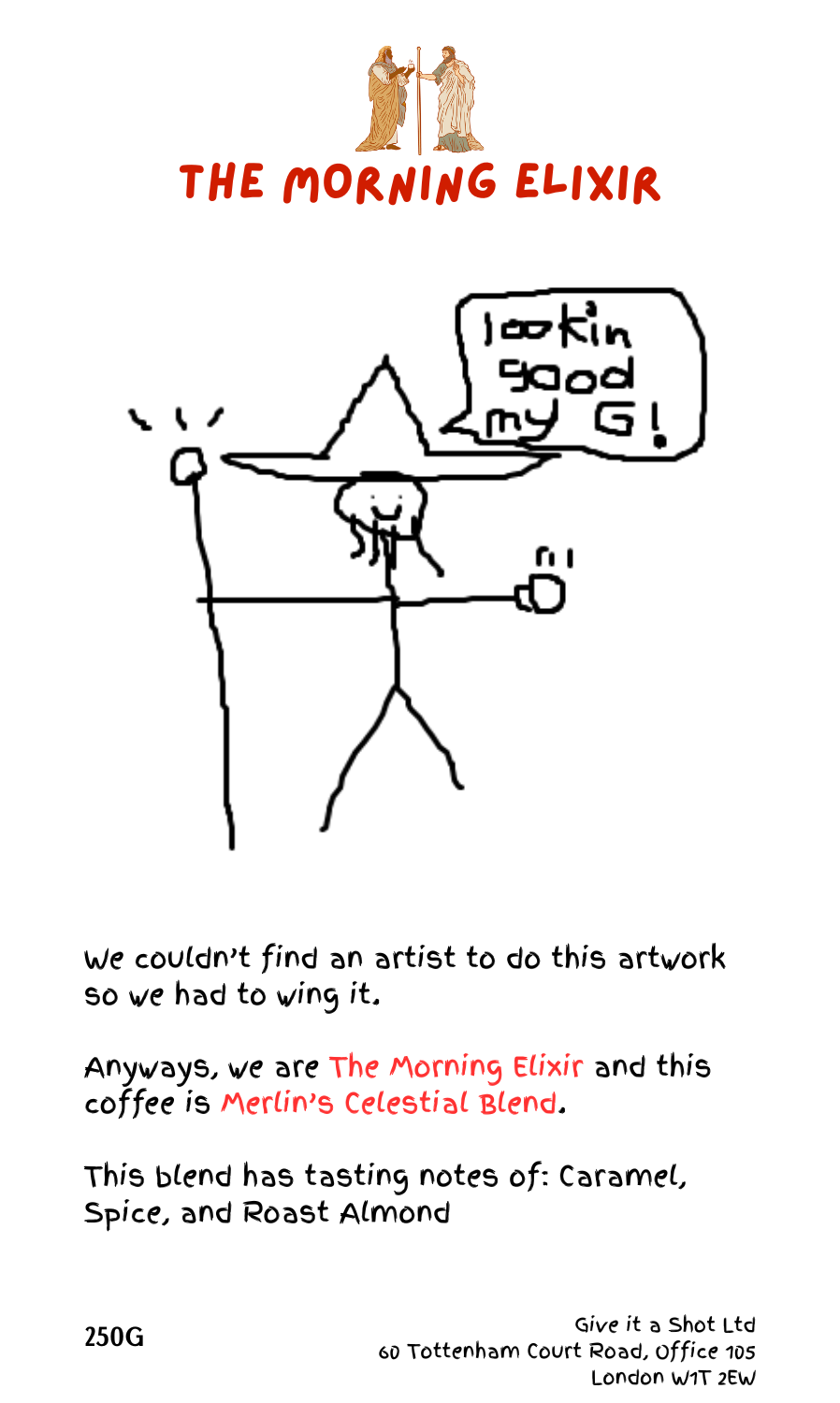 After Merlin’s triumph in Camelot, tales of his Celestial Blend spread like wildfire, and soon, even King Arthur’s Round Table thought to abandon their morning mead for a cup of wizard’s magical blend. But Merlin remained humble, sending shipments far and wide so that anyone—commoner or counsellor—could awaken to inspiration in their cup. Thus, dear coffee aficionado, when you pour yourself a cup of Merlin’s Celestial Blend, remember: you are partaking in a brew born from Brazilian Yellow Bourbon’s sun-kissed heights and Ugandan foothill magic. It is medium-roast alchemy that excels as espresso yet charms as filter—crafted by a wizard’s hand, perfected by farmers’ hearts, and delivered straight to your cauldron (or coffee machine). Drink deeply, for you sip not mere coffee, but a potion of legend.